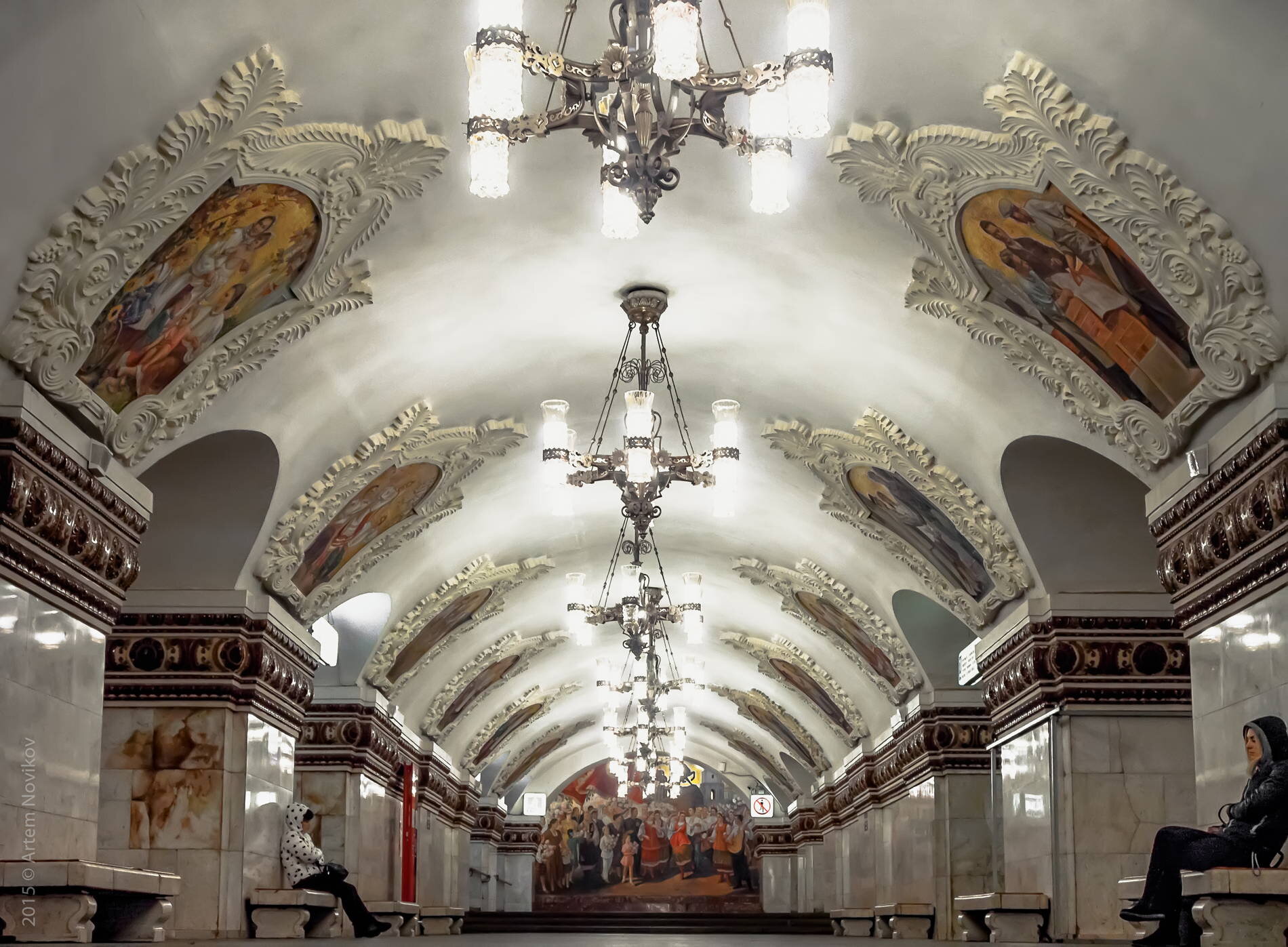 - Люстры и освещение: Люстры на станциях часто выполнены из бронзы и стекла, создавая ощущение дворца. Например, «Станция Курсkая» известна своими величественными люстрами.